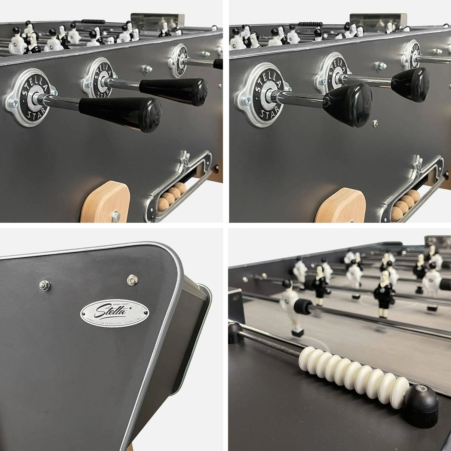 La caisse est en bois laminé HPL gris anthracite (ce matériau est utilisé pour les piscines et les salles d’eau) et bandes de finition en aluminium brossé. Les pieds sont en bois massif de Moabi sont protégés par un saturateur est équipés de vérins pour être réglés. La visserie et les barres télescopiques de 15 mm sont en inox, elles ne rouillent pas. Les buts et paliers sont en inox et les amortisseurs en caoutchouc. Retrouvez les frissons du jeu entre amis ou en famille autour de ce modèle Stella Star d’extérieur. Les nostalgiques vont adorer ce modèle de babyfoot qui était celui que nous pouvions retrouver dans les cafés. Construit pour durer, les amortisseurs sont plus épais et les matériaux encore plus robustes. D’un aspect chic et vintage avec son arrivée de balles centrale et les cendriers de chaque côté, il peut être transmis de génération en génération.