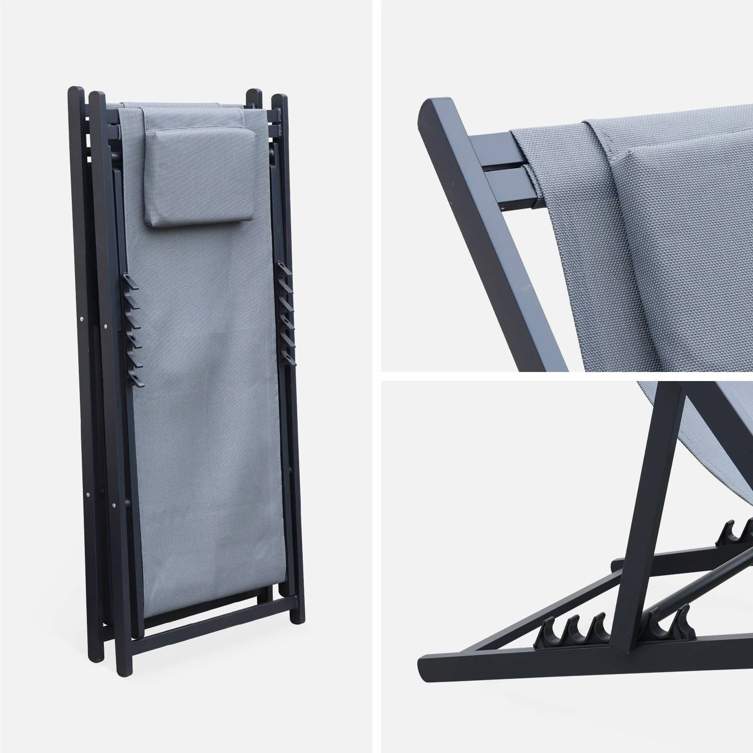 Afin de vous offrir une détente optimale, le dossier des chiliennes est multi-positions (5 positions) et doté d’un coussin repose tête. Ces transats de jardin sont pliables pour être rangés facilement.