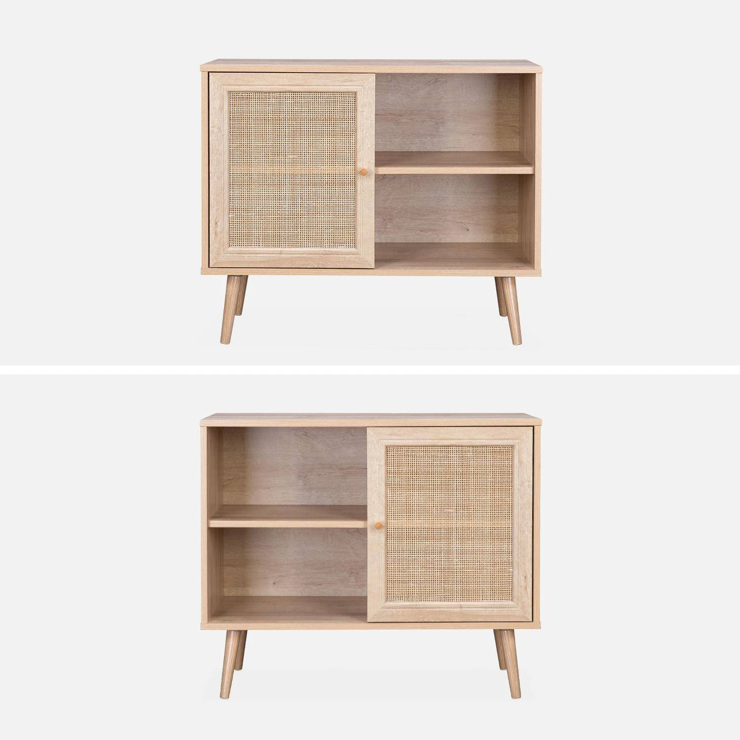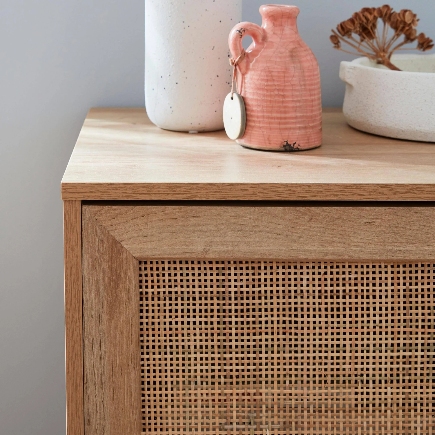 L’esprit nature s’invite dans votre intérieur avec ce meuble de rangement au charme bohème. Avec sa porte en cannage et sa structure en décor bois, il combine élégance et authenticité. Ses pieds compas scandinave en font un meuble au look rétro qui deviendra vite la nouvelle pièce maîtresse de votre intérieur.