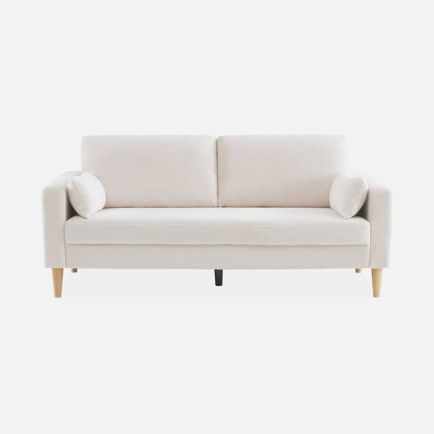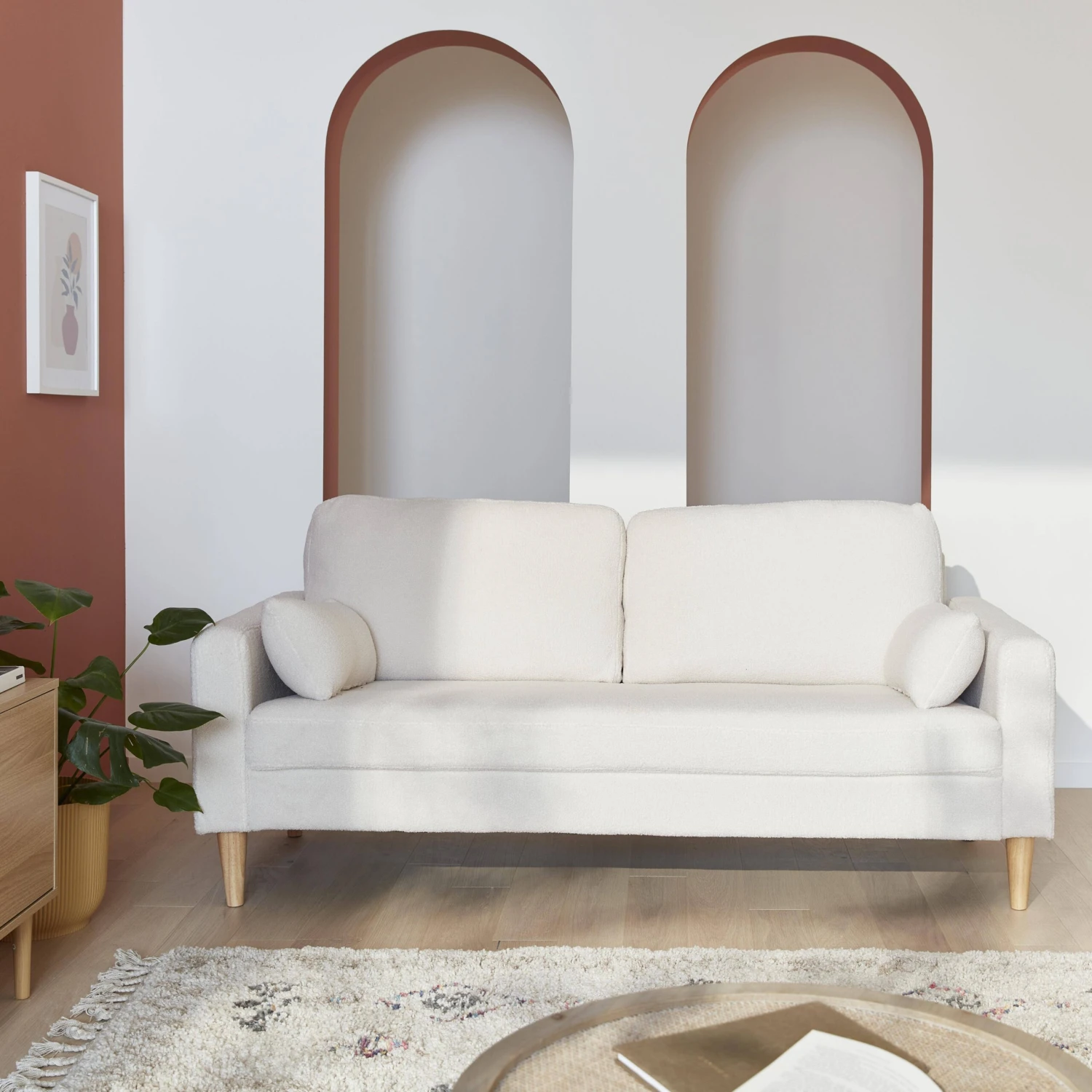 Ce canapé aux lignes arrondies est une invitation au cocooning. Avec son revêtement bouclette tout doux, effet laine de mouton, vous n’aurez qu’une envie, vous blottir dans ce petit cocon. Sa structure en bois solide est chaleureuse et son coloris naturel apporte un côté épuré et zen à votre intérieur. Pratique, il se glisse facilement dans de petits espaces. Son assise ferme et profonde ainsi que son dossier épais et ses larges accoudoirs le rendent confortable. Aucun doute, ce canapé fera l’unanimité dans votre maison !