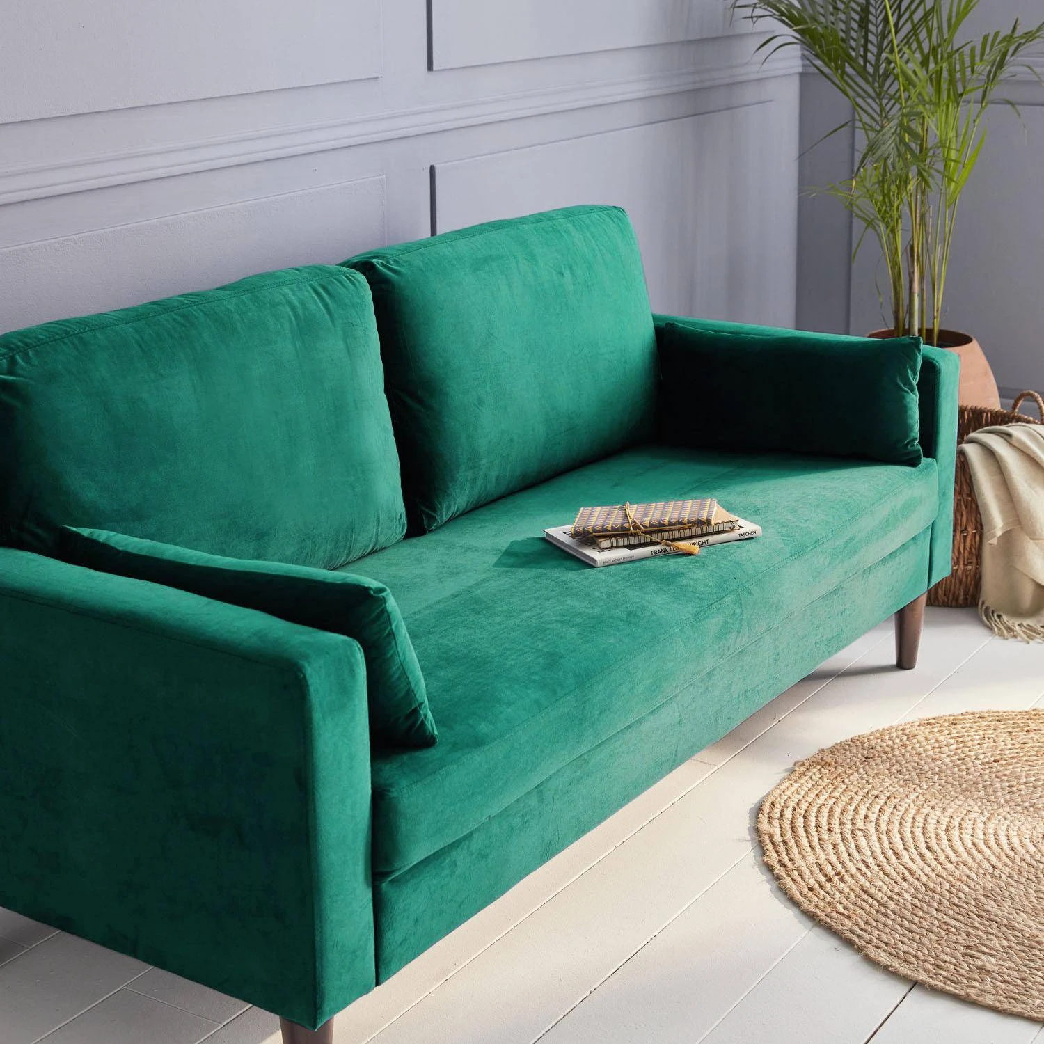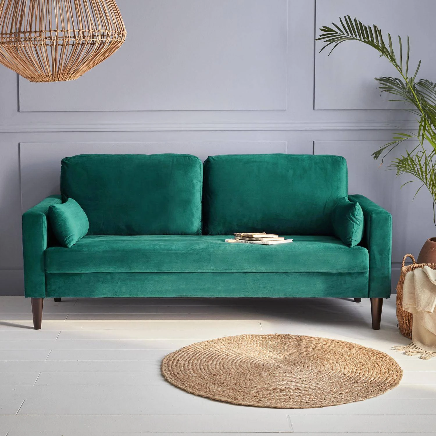 Canapé 3 Places Velours, Pieds Bois D’hévéa Couleur : Vert Anglais