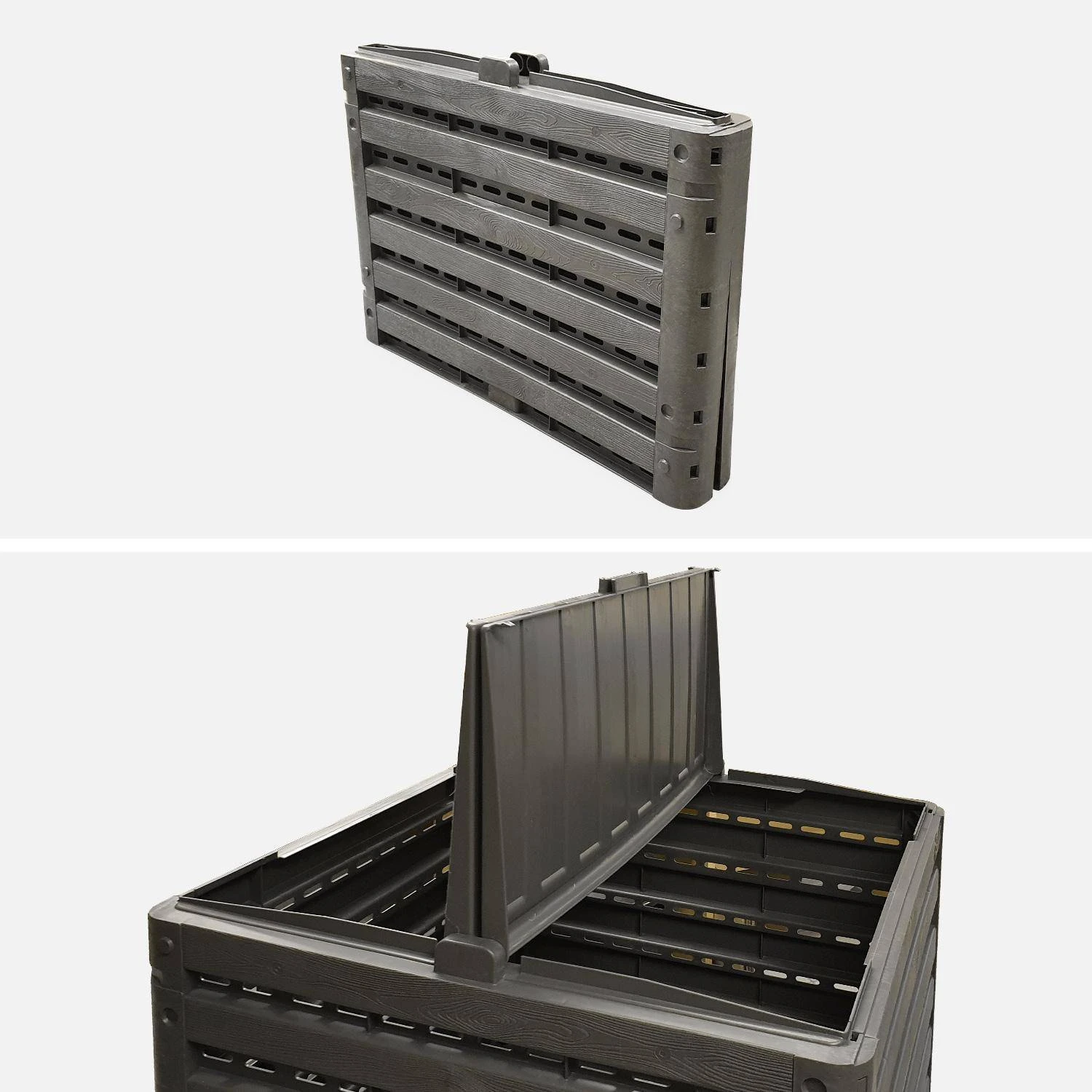 Ce composteur de 400L est conçu en plastique recyclé, imitation bois pour un aspect plus naturel. Il est équipé d’une double ouverture qui facilite le remplissage, de couvercles avec poignée et d’un fond pour faciliter le ratissage. La trappe latérale qui permet de retirer facilement le compost est dotée de poignée et de prises d’air pour permettre une bonne aération et produire un meilleur humus.