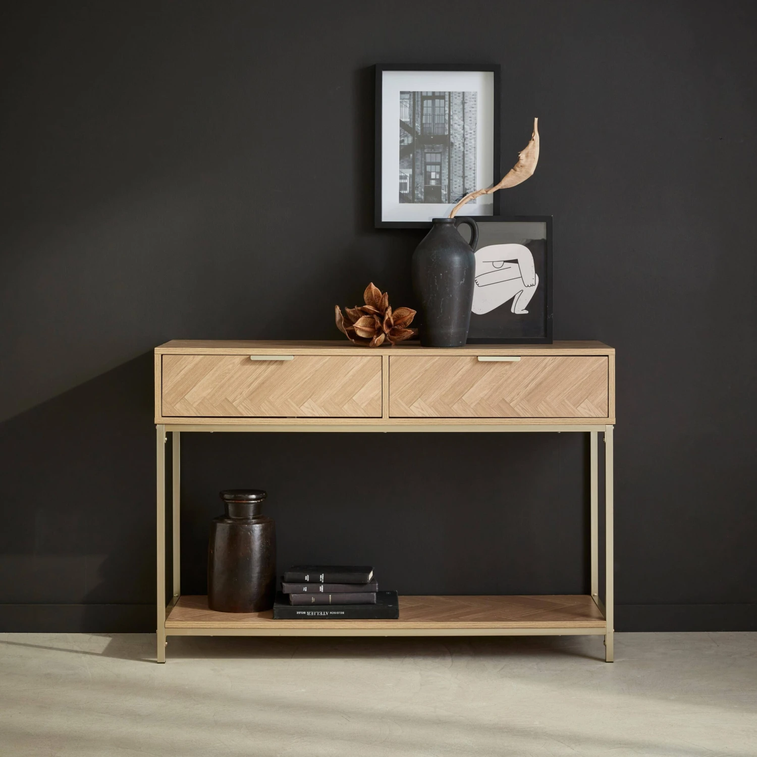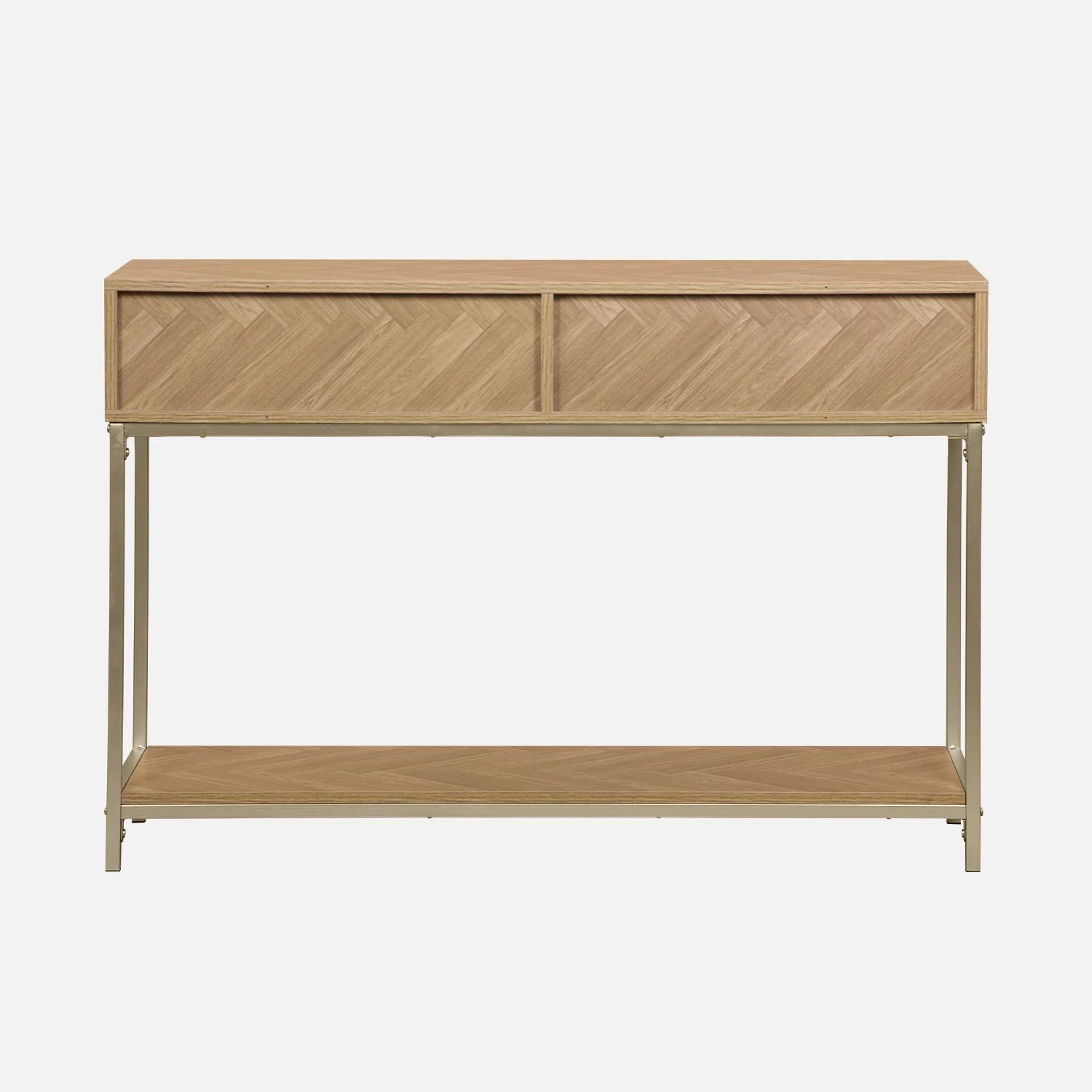 Dans un salon, un couloir ou même une chambre cette console s’inspirant du parquet point de Hongrie apportera beaucoup d’élégance à votre pièce. Ses poignées couleur champagne rectangulaires lui rajoutent un réel charme et font de ce meuble, une console intemporelle. Son décor chevrons qui l’habille permettra à votre intérieur d’avoir une touche d’originalité. Dotée de deux grands tiroirs cette console se voit également très fonctionnelle. Vous pourrez ranger vos clefs, courriers, chargeurs de téléphone, gants à l’intérieur des tiroirs pour les avoir à portée de main. Equipée d’une étagère en-dessous de ses tiroirs, vous disposerez d’un second espace de rangement où vous pourrez y mettre vos sacs à main, ou chaussures. Enfin placez sur son plateau, des bougies, un vase élégant et une jolie coupelle afin de déposer vos clefs pour une touche déco supplémentaire.