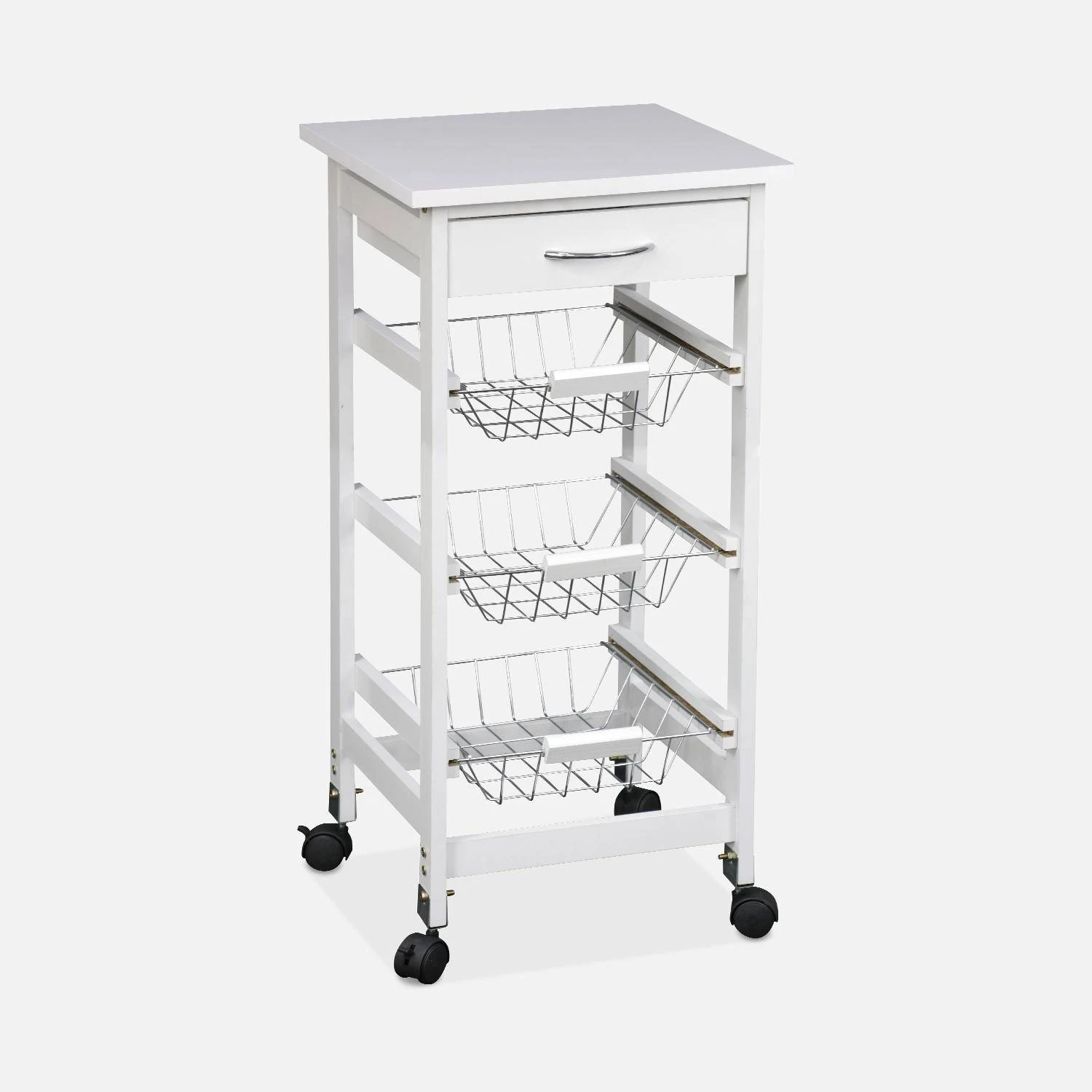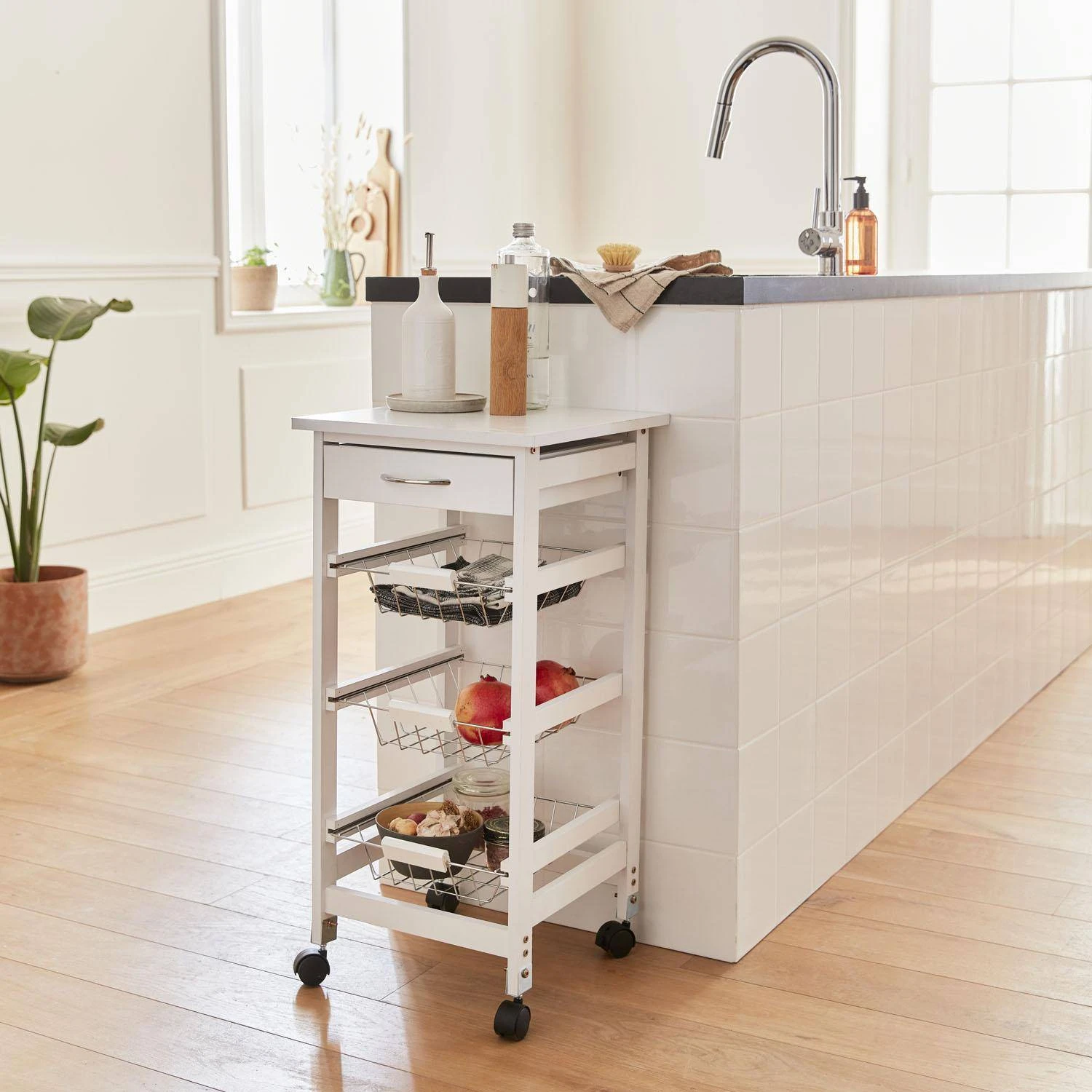 Plus de place pour ranger vos conserves, fruits ou légumes? Cette petite desserte de cuisine à roulettes est le meuble d’appoint idéal pour stocker aliments et autres ustensiles de cuisine. Vous pouvez également ranger couverts ou autres objets au sein du tiroir. 3 paniers en acier inoxydable sont à votre disposition pour un rangement facile. Simple et discrète, cette desserte s’adaptera facilement à n’importe quel type d’intérieur. Pour finir, les roulettes munies de freins permettront de déplacer aisément la desserte entre la cuisine et la zone de repas.