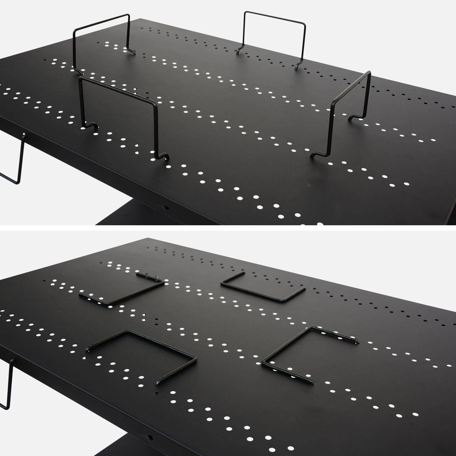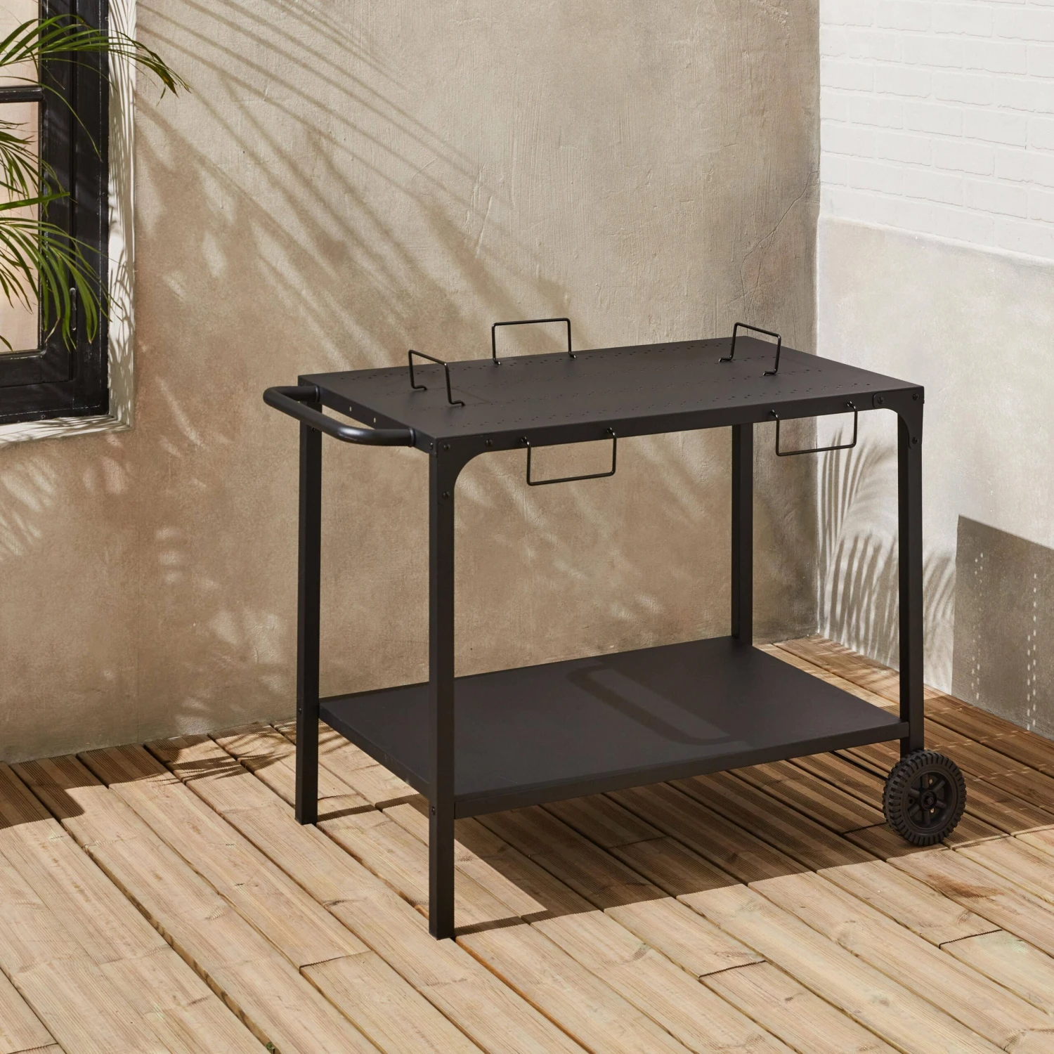 Cette desserte noir en acier est idĂ©ale pour utiliser votre plancha, mais pas que ! 5 crochets mĂ©talliques sont fournis et peuvent ĂȘtre placĂ©s oĂč vous le souhaitez : sur le plateau supĂ©rieur perforĂ© pour caler une plancha ou tout autre accessoire de cuisson, et sur le cĂŽtĂ© pour y accrocher des torchons et ustensiles. Cette desserte s’adapte Ă vos envies et besoins. Vous pouvez d’ailleurs tout autant l’utiliser Ă l’intĂ©rieur qu’Ă l’extĂ©rieur. GrĂące Ă sa poignĂ©e et Ă ses deux roues, elle se dĂ©place trĂšs facilement pour aller sur votre terrasse ou votre balcon pour vos repas conviviaux ! Sur le plateau infĂ©rieur, vous pouvez ranger vos plats ou la bonbonne de gaz de votre plancha.