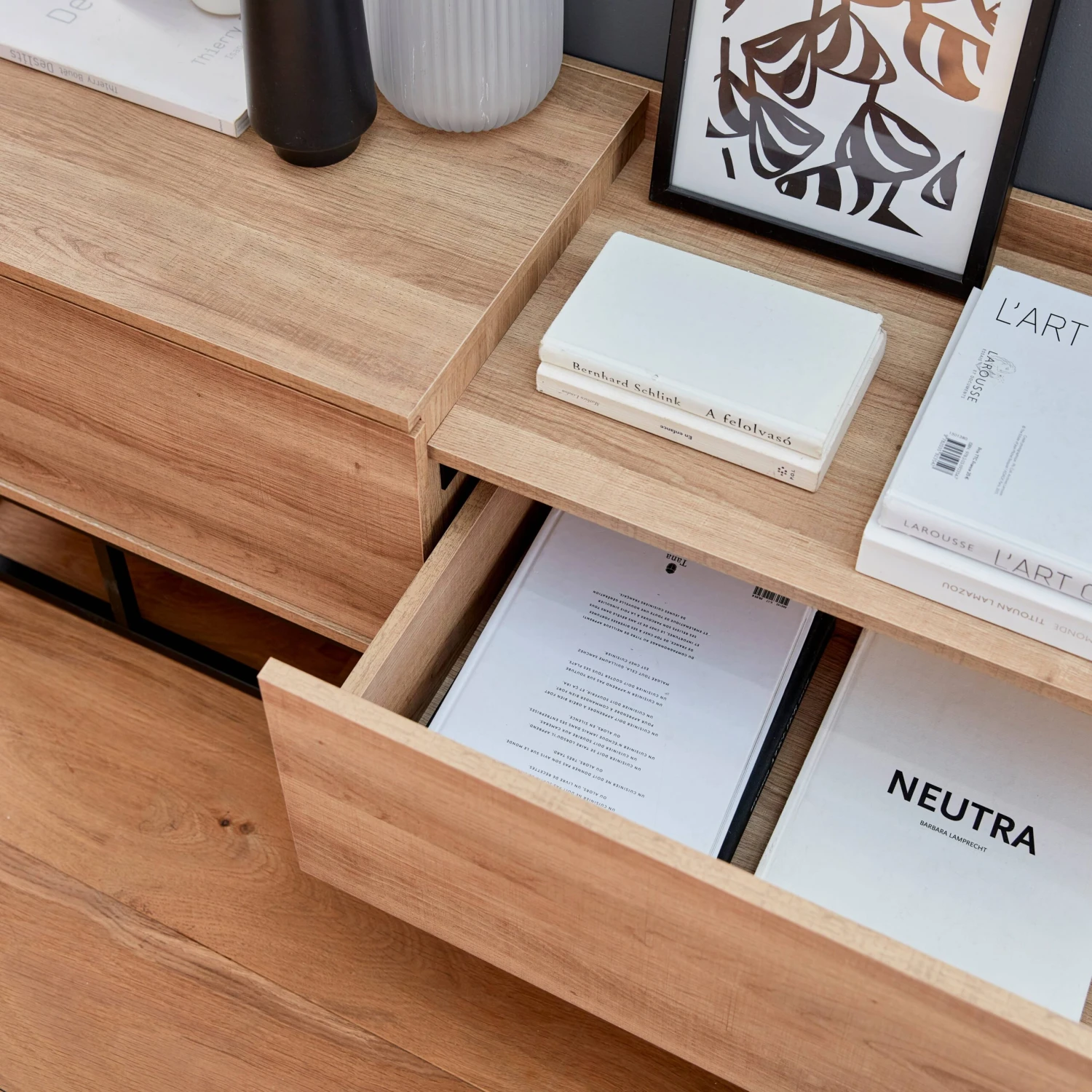 L’association harmonieuse du bois et du métal font de ce meuble TV le meuble parfait pour apporter chaleur et modernité à votre salon. La sobriété du bois et l’éclat du métal noir donneront à votre intérieur un style industriel et contemporain qui sera du plus bel effet.