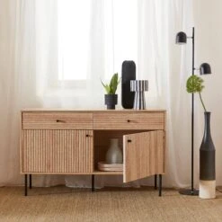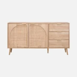 Buffet De Rangement Décor Bois Et Cannage Arrondi 2 Portes, 3 Tiroirs 150 Cm