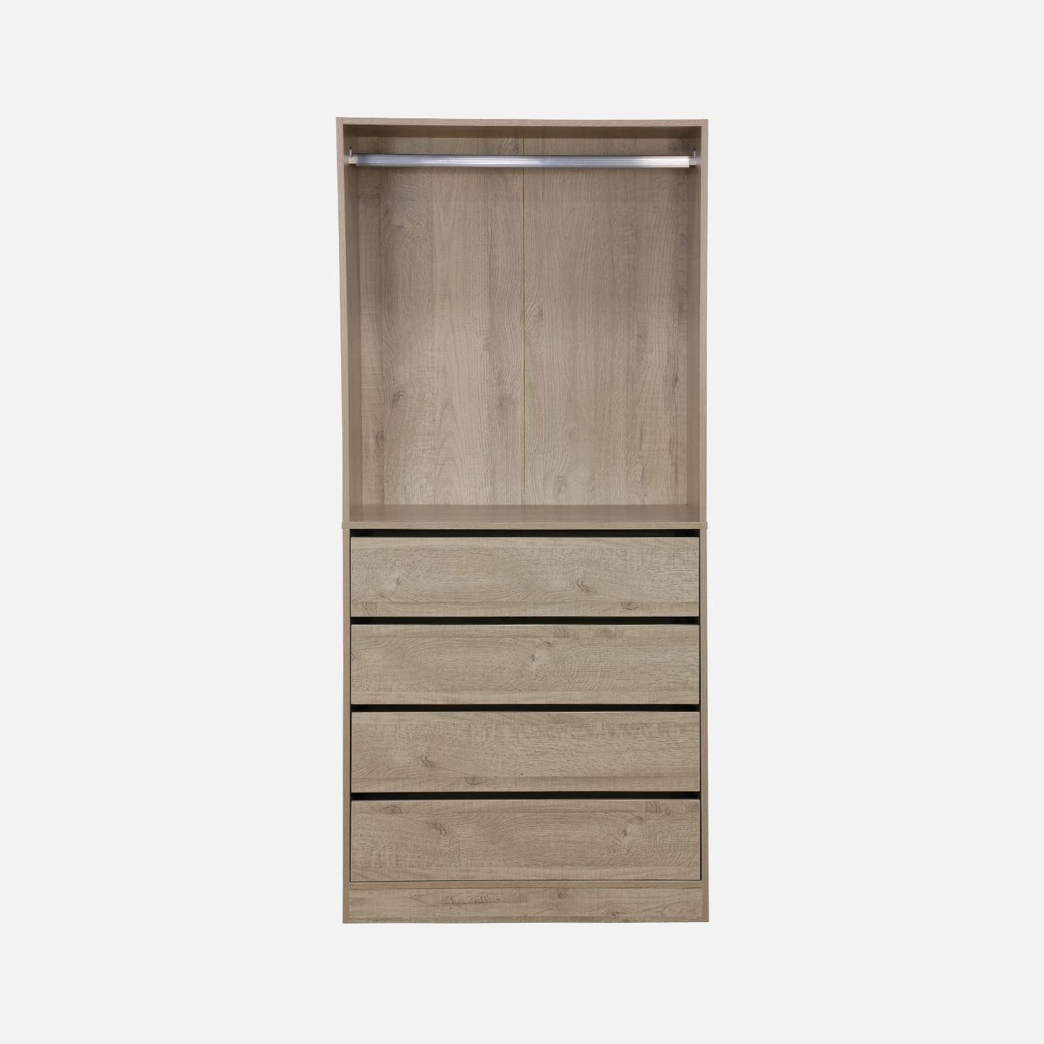 Avec ses 4 tiroirs et sa penderie, ce module dressing offre de belles possibilitĂ©s de rangement. La penderie vous permet de pendre les vĂȘtements que vous ne souhaitez pas plier et ses tiroirs vous permettront de ranger facilement vos vĂȘtements. Sa couleur sobre et son design moderne lui permet de trouver facilement sa place dans votre maison.Â