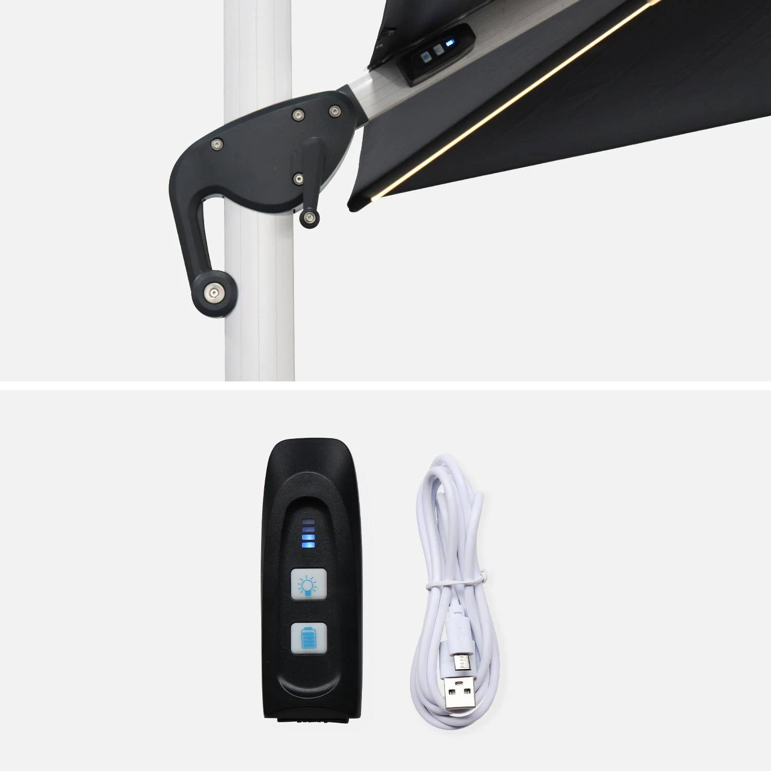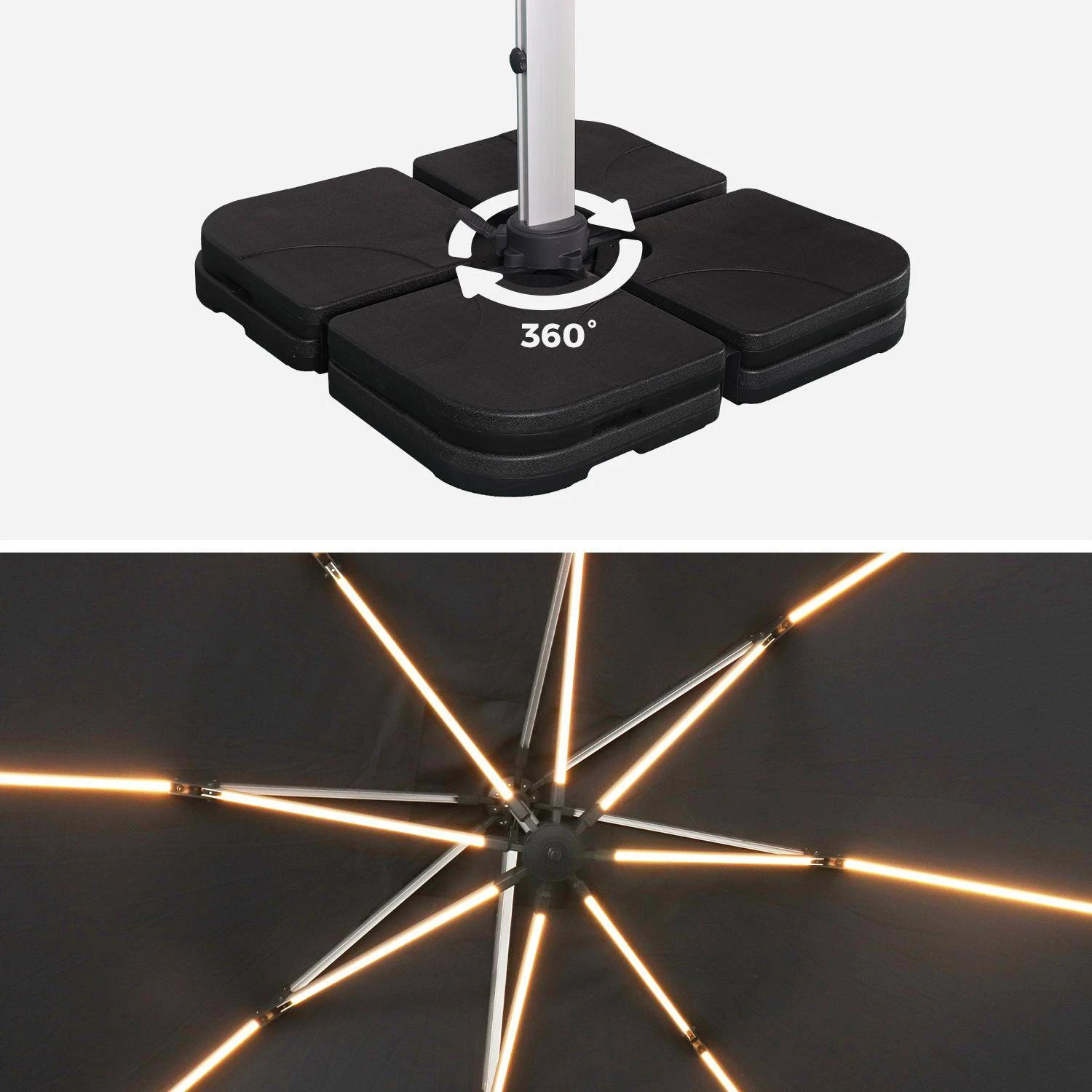Grâce à ses bandes Led situées sur les baleines vous pourrez profiter de votre terrasse ou de votre jardin même à la nuit tombée. Lorsqu’il est éclairé, le parasol crée une atmosphère unique et chaleureuse. ll vous éclairera pendant 4 heures grâce aux led situées sur les baleines. La batterie se charge automatiquement grâce au chargeur solaire ou grâce à un chargeur micro USB.
