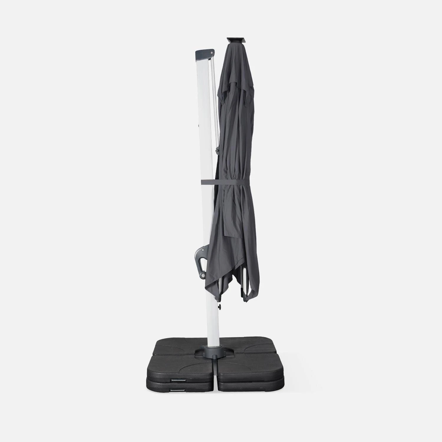 Il est indispensable de lester votre parasol (au moins 80kg). Attention, les dalles nécessaires pour lester le parasol ne sont pas fournies, vous retrouverez une sélection de dalles dans notre boutique (remplissables ou en résine). Vous trouverez également des lests spéciaux en béton (40x40cm à 50x50cm) dans les grandes surfaces de bricolage.