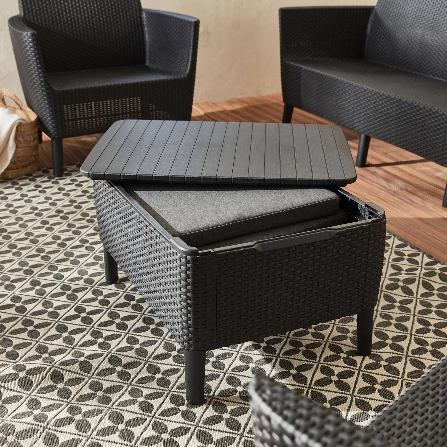 Les assises de ce salon permettront d’accueillir 5 convives, idéal pour un apéro entre amis. Aucune matière sensible, il sera donc très facile de l’entretenir. Sa couleur graphite est tendance et s’accomodera à tous les styles. Ces assises sont livrées avec des coussins qu’il sera aisé de ranger en temps de pluie grâce à la table basse doté d’un plateau amovible.