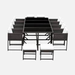 Table De Jardin Encastrable Résine Tressée 8 Chaises, 4 Poufs Couleur : Marron / Ecru